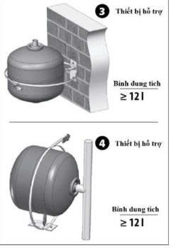 – Trong trường hợp phải dùng nhiều bình tích áp được kết nối nối tiếp hoặc song song với nhau, chúng bắt buộc phải được kết nối ở cùng một mặt phẳng. – – Nếu Bình áp lực có dung tích trên 12L được lắp, gắn lên trên, cần phải có một bộ phận đỡ thích hợp, nếu không có bộ phận hỗ trợ thì không được lắp tránh gây ra hậu quả nghiêm trọng.