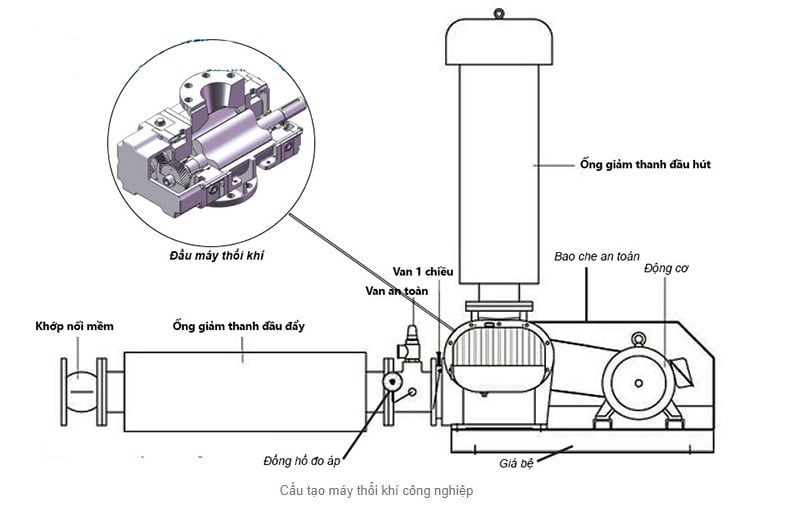 Máy thổi khí công nghiệp có cấu tạo gồm 3 phần chính. Đó là đầu máy thổi khí, động cơ, giá bệ để gắn động cơ và đầu máy thổi và một số phụ kiện khác.